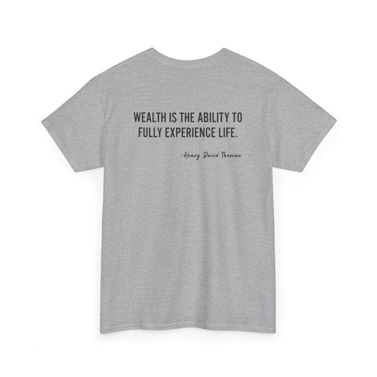A simple, thoughtful tee that speaks softly but clearly. This classic crew T-shirt carries minimalist, type-driven quotes on both front and back — short statements that shift the focus from accumulation to experience. The smooth, midweight cotton feels steady against the skin, while the relaxed cut and ribbed neckline keep the silhouette familiar and easy to wear. It’s the kind of shirt you reach for when you want clothing that echoes your values without shouting: quiet confidence, measured intention, and room for the day’s small moments.