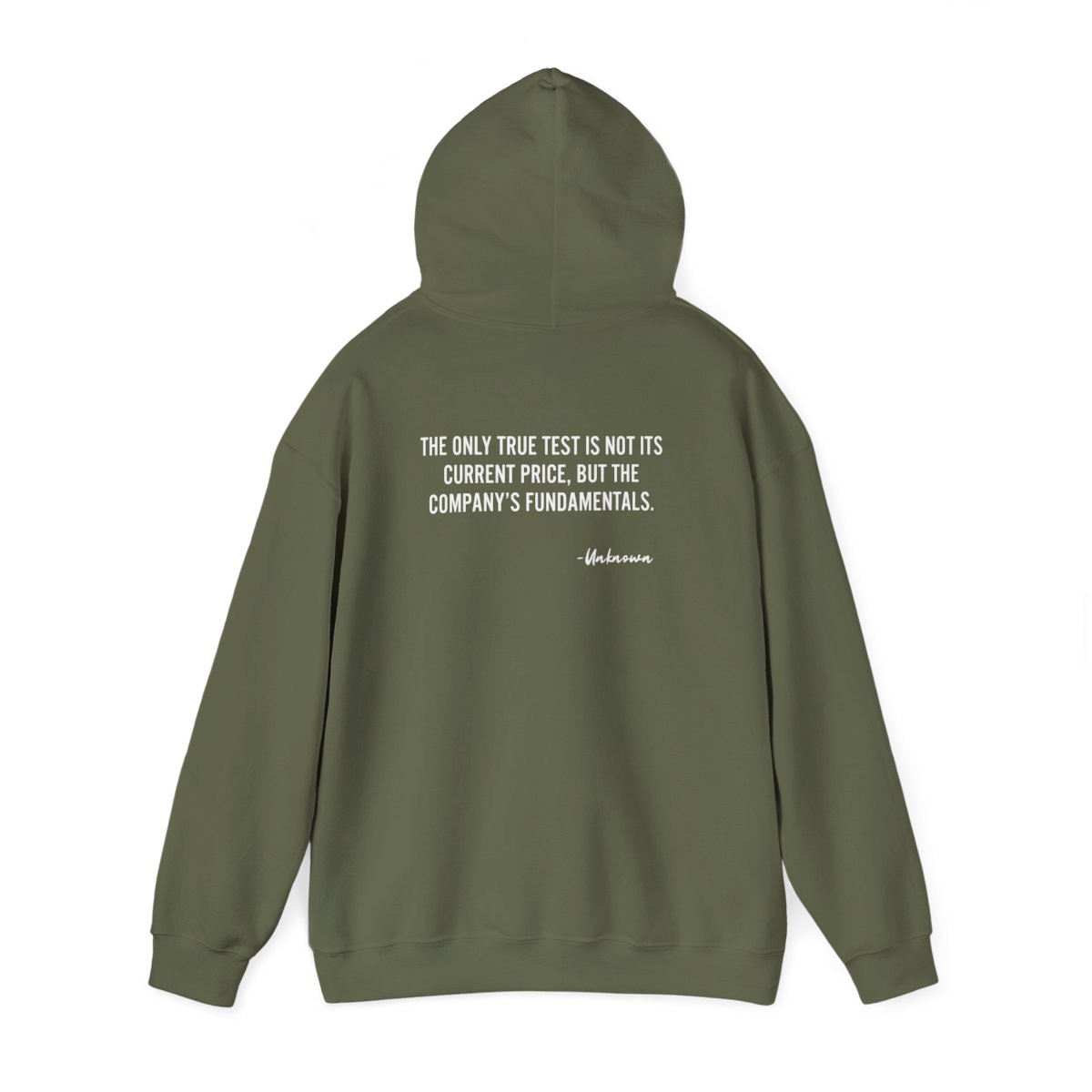 Soft, roomy hoodie designed for people who live and breathe markets and long-term investing. The muted olive tone and clean white typography keep the look calm and confident. Short, thoughtful quotes printed on the front and back create quiet reminders to stay patient and focused — something the wearer will reach for on early mornings at the desk, weekend research sessions, or low-key meetups with fellow investors. The roomy kangaroo pocket and double-lined hood make it cozy without feeling bulky, while sturdy cotton/poly blend holds prints and embroidery well. Subtle details — color-matched drawcord, tear-away label, and eco-minded materials — give a refined, responsible finish.