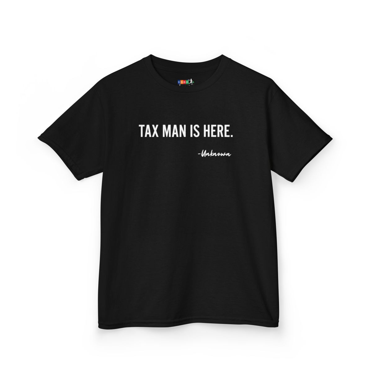 Simple, bold, and a little cheeky — this kids' tee speaks up with clean typography and a wink. The black midweight cotton feels soft against skin and holds shape through play. Short sleeves and a classic crew neckline keep it comfortable for school days, family outings, and lazy weekends. The front states "TAX MAN IS HERE." in clear, confident type; the back continues the joke with a smaller line: "I'M NOT AVOIDING RETIREMENT, I'M SUSPENSE-BUILDING." Together they create a playful, grown-up sense of humor kids can wear with a grin.
