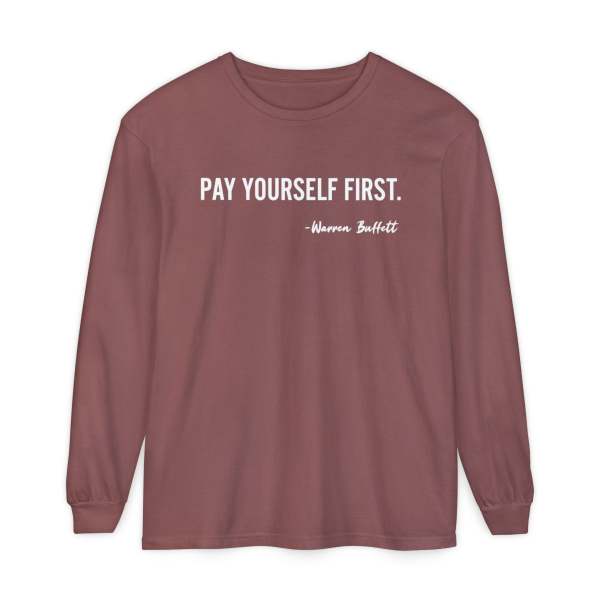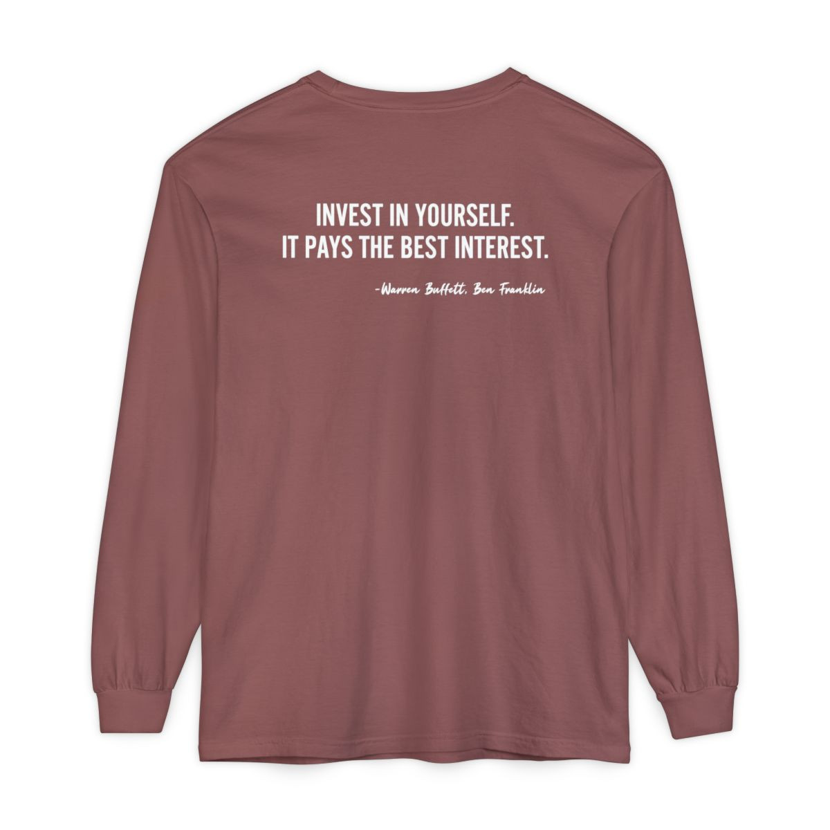 This long-sleeve garment-dyed shirt blends everyday comfort with calm confidence. The muted, softly washed color and classic fit make it feel lived-in from day one. Clean, white lettering across the chest reads a quiet money-mindset reminder; smaller matching text across the upper back extends the thought into an encouraging nudge to prioritize self-investment. Lightweight but substantial cotton drape, ribbed cuffs, and reinforced seams mean it moves with you through errands, coffee-shop planning sessions, or low-key work-from-home days. Wear it when you need a subtle reminder to choose yourself first — steady, understated, and durable enough to become part of a regular routine.