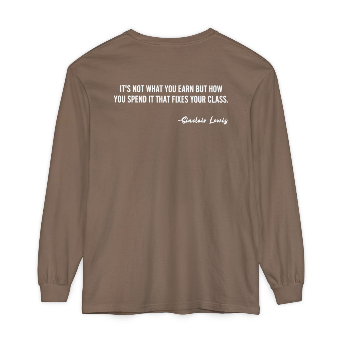 A soft, garment-dyed long sleeve that carries quiet confidence. The muted mauve tone and crisp white quotes on front and back make this shirt feel like a shared secret among people who care about smart choices and understated style. Wear it on a slow morning with coffee or layered under a jacket for casual meetings. The classic fit and midweight cotton drape comfortably while the ribbed cuffs and reinforced neck keep the shape through washes. It reads like a small life lesson you can wear — thoughtful, calm, and slightly clever.