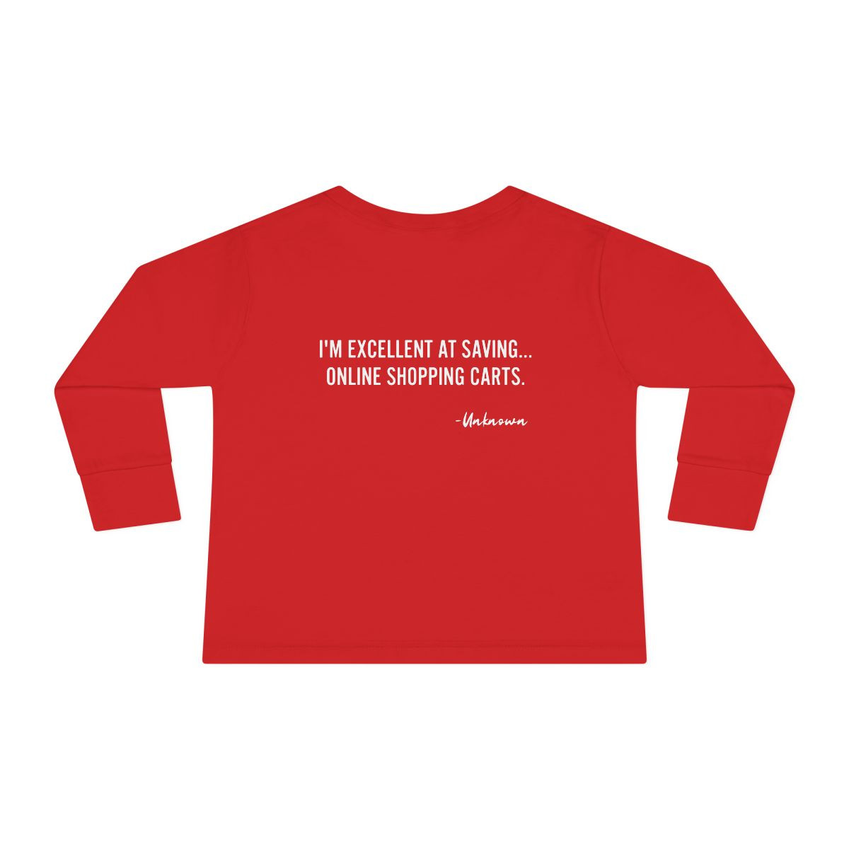 Soft, light, and playful — this toddler long sleeve tee brings grown-up humor down to pint-sized proportions. The deep blue cotton feels gentle against small skin while neat ribbed cuffs and a reinforced neck keep the tee looking tidy through play and washes. Front and back micro-text prints share quick, witty lines that read like inside jokes between family members who love lake days, summer laughs, and online cart victories. It sits comfortably on a toddler’s frame with side seams for structure and a tear-away label so there’s no scratchy tag to fuss with. Dress it over shorts for warm afternoons or layer it under a jacket for chilly mornings — it’s an easy, everyday layer that sparks smiles and conversations.