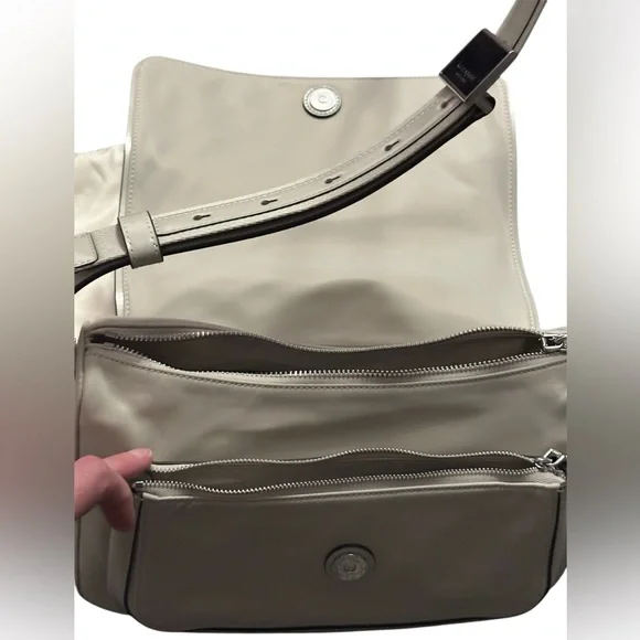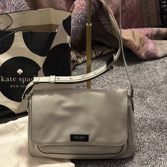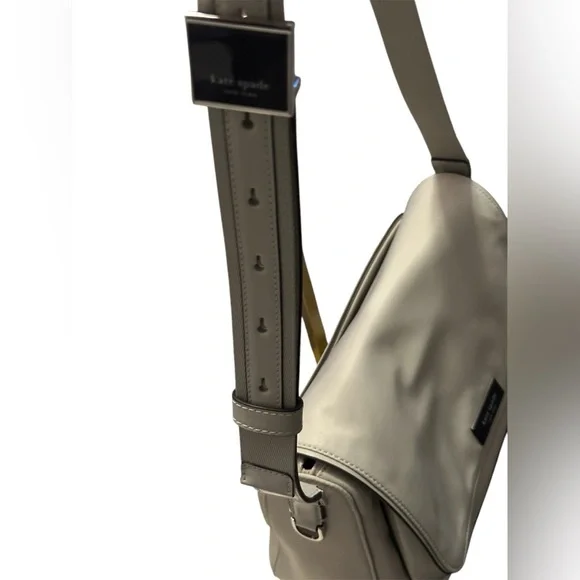 NWT Kate Spade Sam Icon Medium Messenger Bag from Smoke Free and Pet Free home! This is gorgeous crossbody in cream with such detail with black hardware on the strap. Nylon material and canvas strap. It comes with the dust bag and tags. 7.5"h x 11.5"w x 4"dStrap drop: 22"100% recycled nylon with smooth leather trim100% recycled polyester liningPlaque logoMessenger bag with snap flap closureInterior zip pocketInterior slip pocketExterior zip pocketAdjustable crossbody strapFits current iPhone, iPadImportedStyle No. KB135