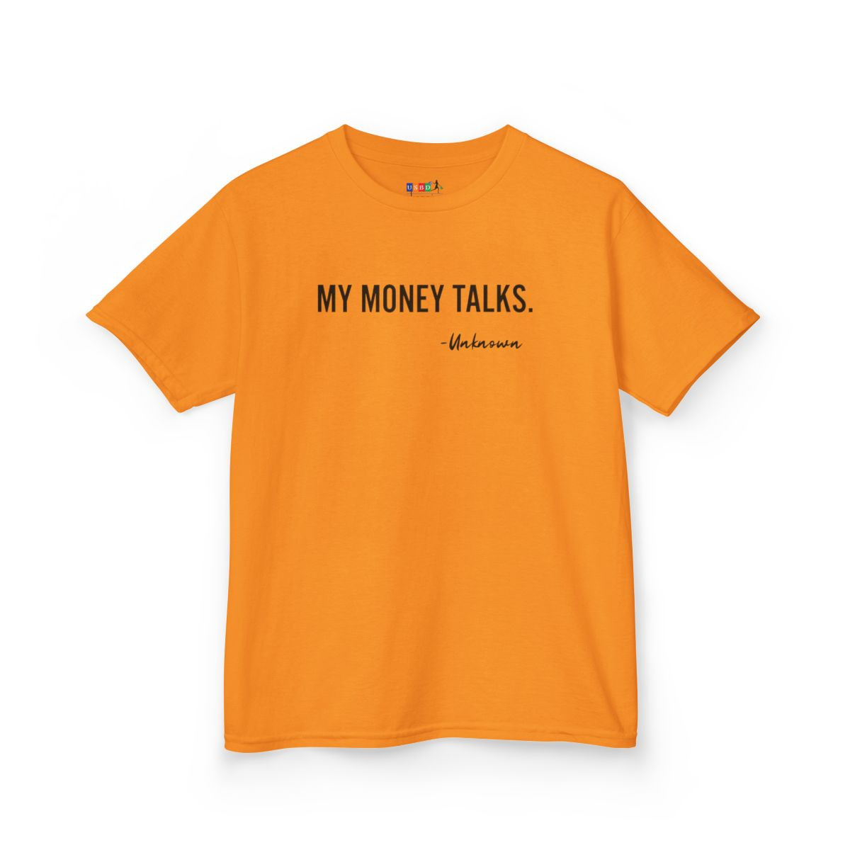 A crisp, white kids tee that speaks softly but confidently. Clean, minimalist text sits on the chest reading “MY MONEY TALKS.” in a muted sans-serif, with a small signature beneath. On the back a short, thoughtful finance-minded line encourages small, daily choices that add up. Lightweight yet durable midweight cotton keeps the shirt breathable and ready for play. This tee fits into everyday wardrobes while sparking quiet conversations about value, saving, and smart habits — a subtle nudge toward financial curiosity for young learners who notice details and like to express themselves with understated style.