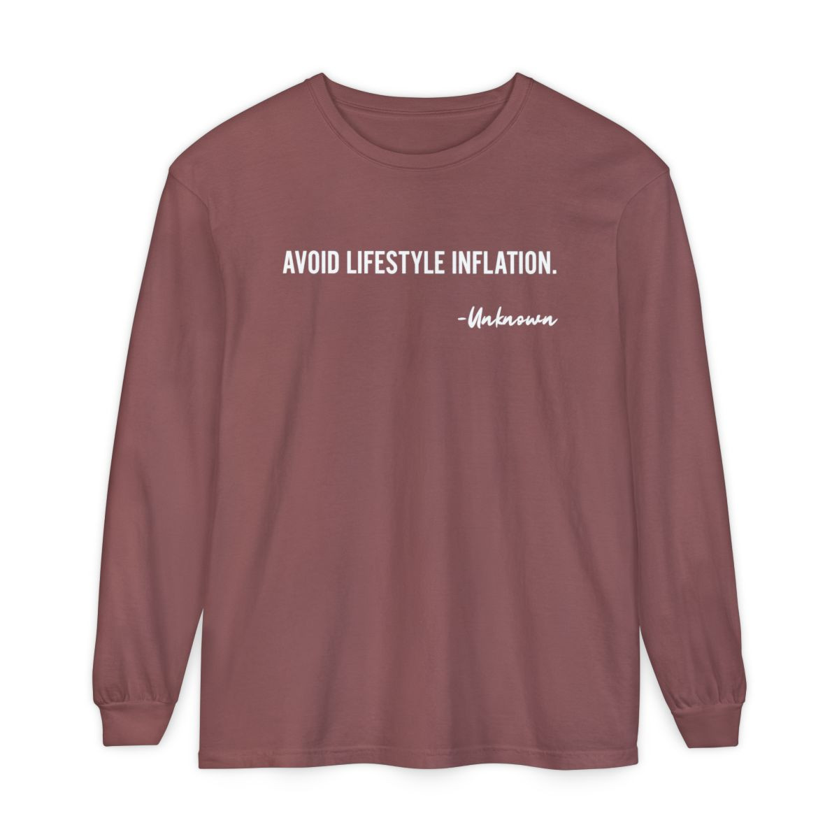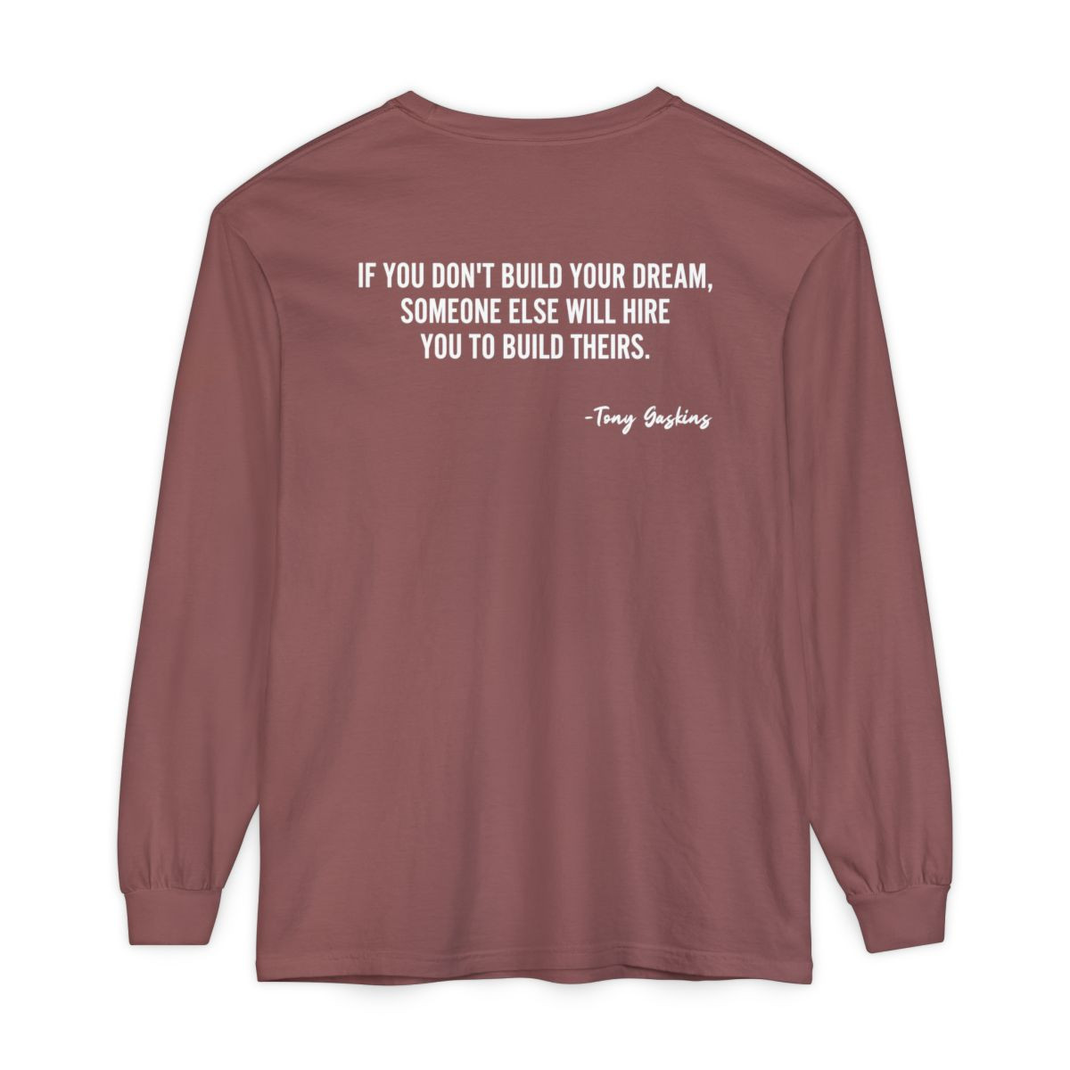 A lived-in long sleeve that speaks plainly to makers, hustlers, and thoughtful doers. This garment-dyed tee wears in soft and muted—like a notebook stained with coffee and late-night plans. The front offers a short, pointed line about resisting lifestyle inflation; the back carries a blunt push to build your own dream. It hangs loosely in a classic fit, sleeves cinched by ribbed cuffs, and the cotton settles against skin with the quiet comfort of something you reach for when plans need focus. Wear it to co-working sessions, weekend strategy walks, or evenings sketching next steps—let it be the shirt that reminds you why you chose the harder, more honest route.