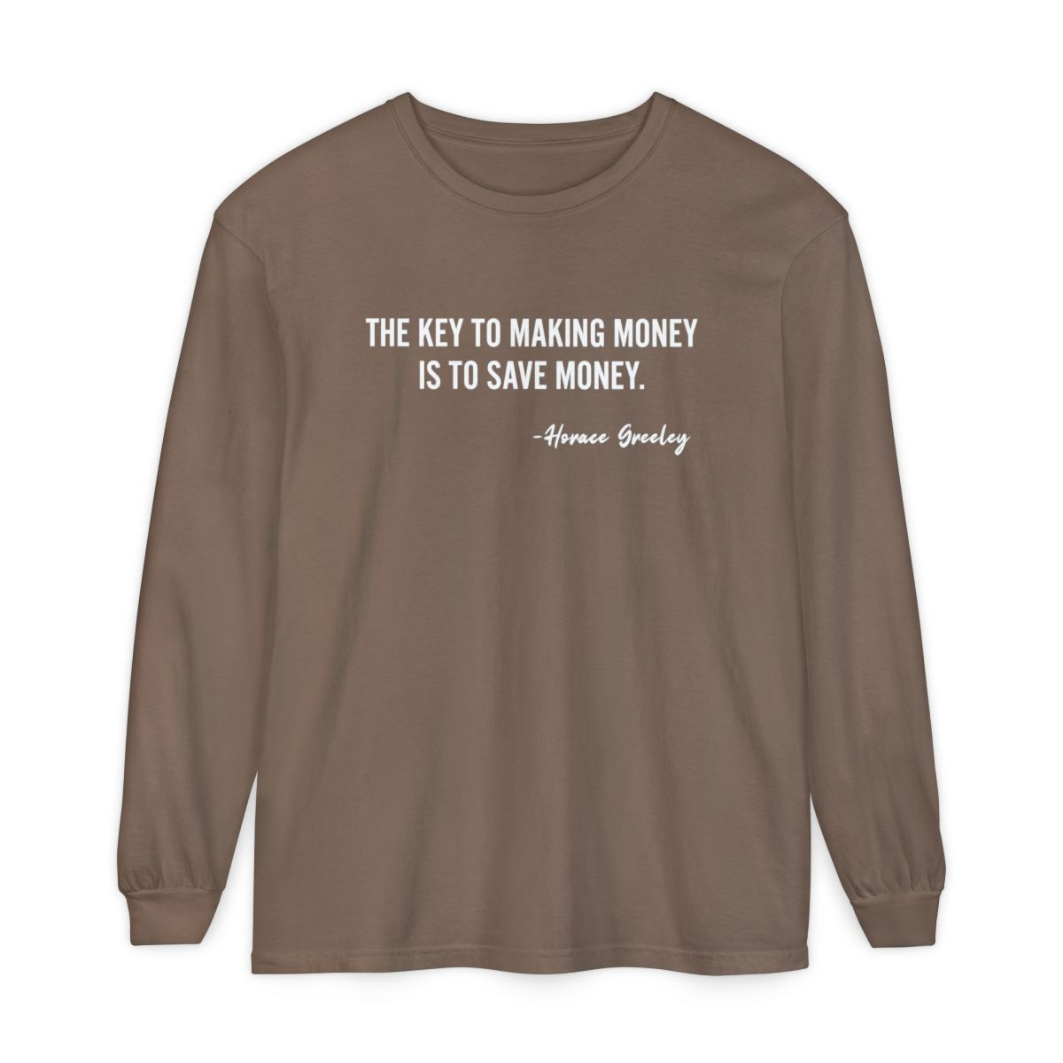 A soft, garment-dyed long sleeve that carries quiet confidence. The muted mauve tone and crisp white quotes on front and back make this shirt feel like a shared secret among people who care about smart choices and understated style. Wear it on a slow morning with coffee or layered under a jacket for casual meetings. The classic fit and midweight cotton drape comfortably while the ribbed cuffs and reinforced neck keep the shape through washes. It reads like a small life lesson you can wear — thoughtful, calm, and slightly clever.