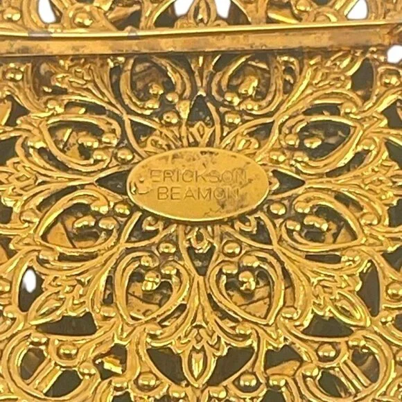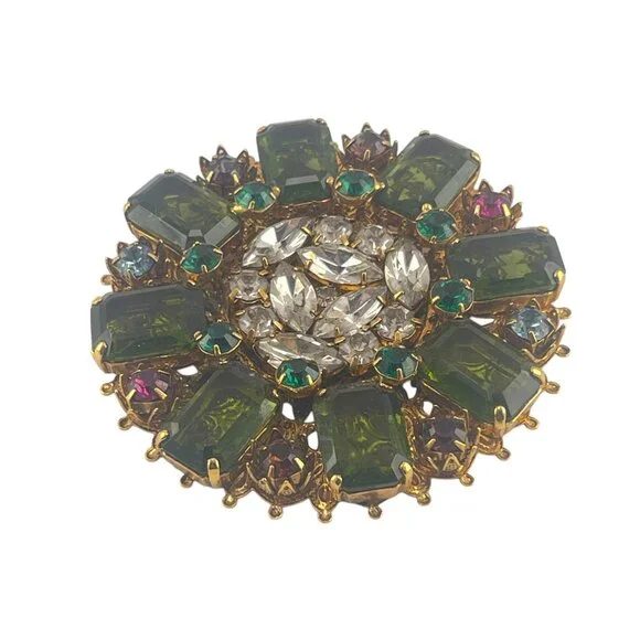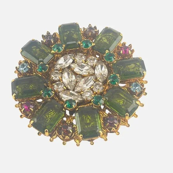 This exquisite vintage brooch showcases a stunning floral design with dazzling Czech rhinestones in vibrant green, accented with multicolored gems. Its intricate gold-tone backing adds a touch of elegance, making it a striking accessory. Measuring 3 inches in diameter, this brooch is an ideal statement piece for those who appreciate classic style and craftsmanship.Erickson Beamon is known for its avant-garde, handcrafted jewelry that pushes the boundaries of traditional design. The brand's pieces are celebrated for their bold and intricate designs, which often incorporate an eclectic mix of materials• Czech rhinestones• Floral design• Gold-tone backing• Secure pin closure3'' diameter