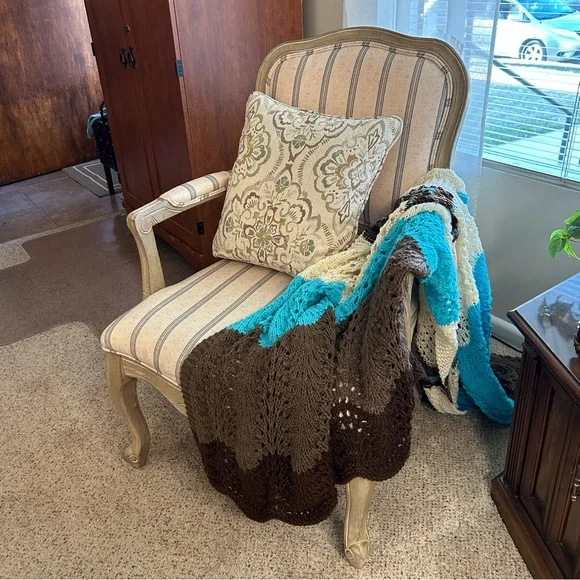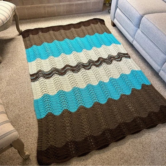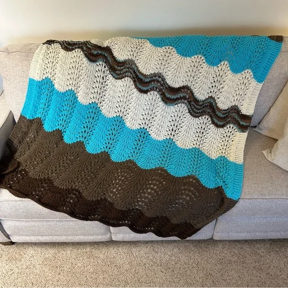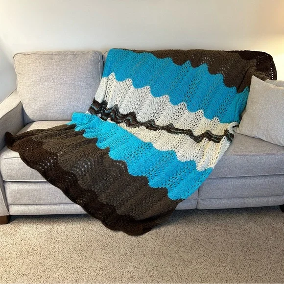 Beautiful Hand Knit Afghan Granny blanket or throw blanket for sofa, couch, recliner, chair or bed.Looks and feels like new.Sz Open soft knit pattern adds just a touch of coziness & warmth without too much.Pleasing combination of light robin’s egg blue, beige and brown.College Dorm ready creating awarm atmosphere reminiscent of home.52 inches X 75 inches.No rips, tears, snags, stains, or defects. Smoke free.Fast shipping -uses USPS Two day priority shipping. So depending on how efficient I am - you should receive your item quickly bar tornadoes, floods, earthquakes, blizzards, ice storms, & zombie apocalypses.Have a great day. Live Long and Prosper 🖖Fast shipping -uses USPS Two day priority shipping. So depending on how efficient I am - you should receive your item quickly bar tornadoes, floods, earthquakes, blizzards, ice storms, & zombie apocalypses.Have a great day. Live Long and Prosper 🖖LiCottagecore, Grannycore, Farmhouse, Grandmacore, Maximalism, Minimalism, Dorm Ready, College Student, Den, Couch, Sofa Throw, Armchair, Reading Lap Blanket, Throw, Afghan, Crochet, Knit, Handmade, Hand Crafted, Homemade, One-of-a-Kind, OOAK, Unique, Contemporary, Versatile, Colorful, Bright, Pastel, Pastel-goth, Wrap, Comforter, Bedspread, Bed Topper, Brown, Beige, Blue, striped, zigzag, mocha,